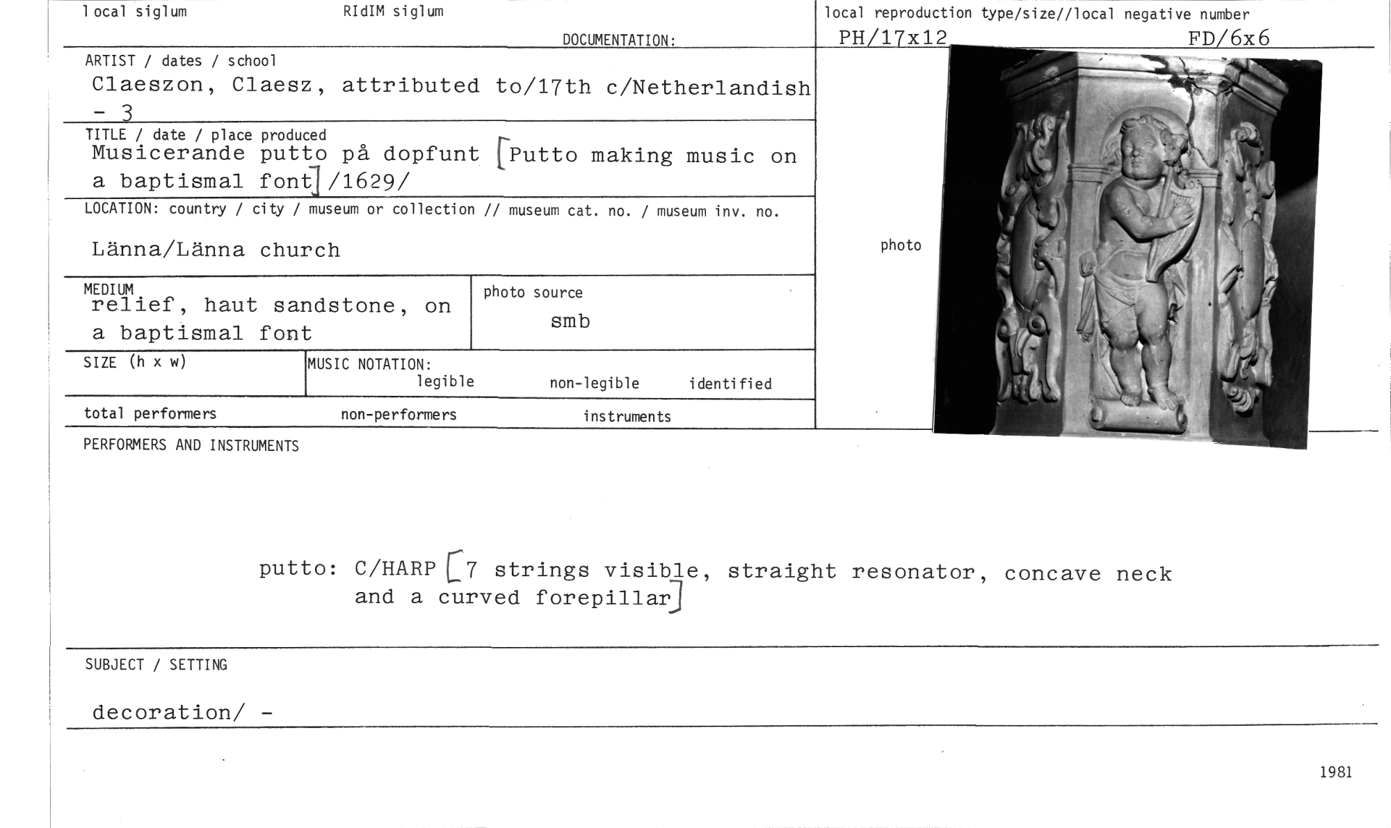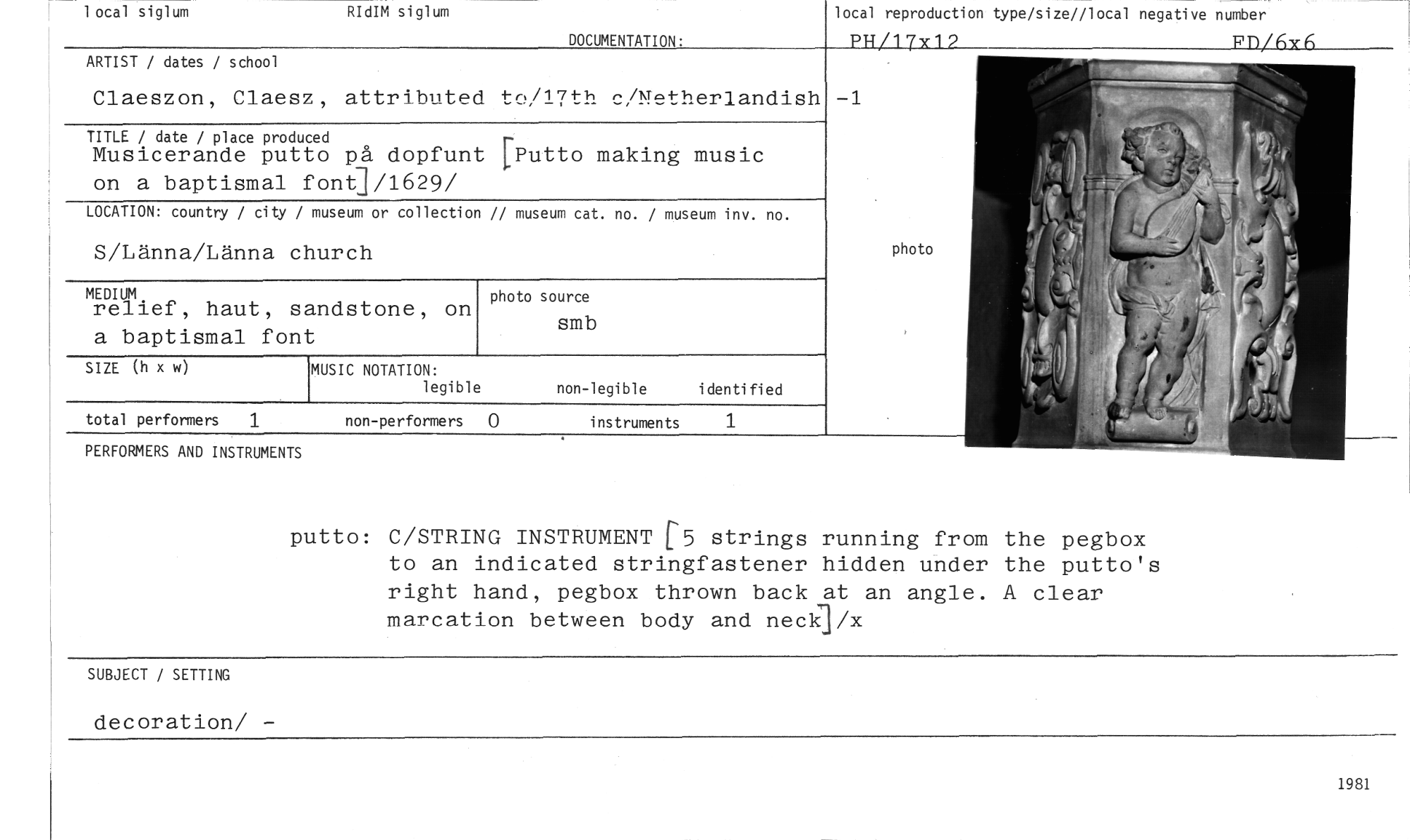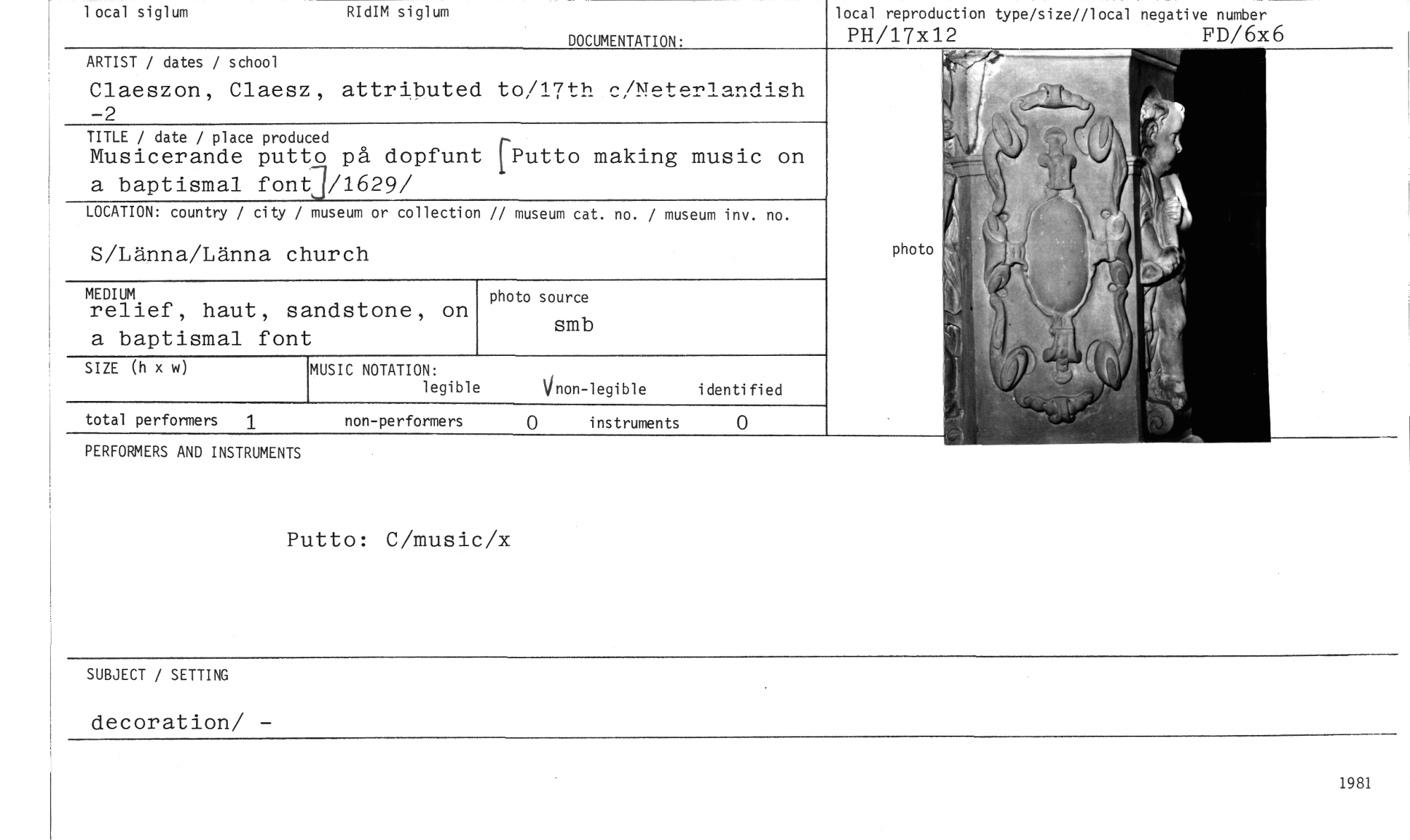 | Muciserande putto på dopfunt Music-making putto on a baptismal font